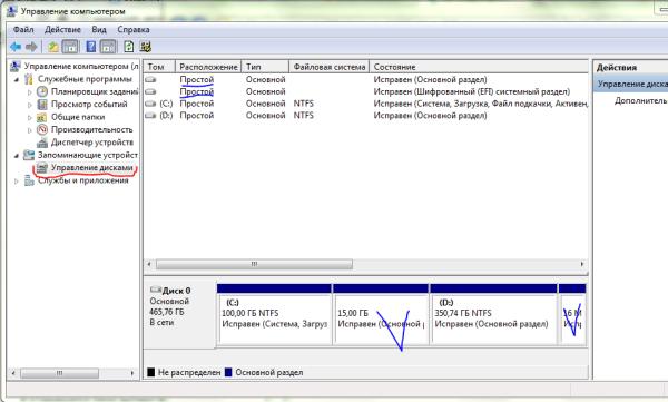 Приступаем к делу: Нажимаем «Пуск» и выбираем «Панель управления» > «Администрирование» > «Управление компьютером», далее, в левом окне, «Управление дисками». Видим примерно следующее: