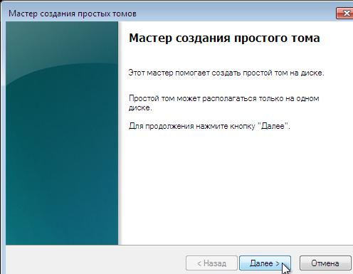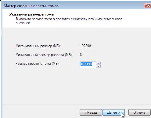 В котором мы укажем требуемый размер нового тома (логического диска). По умолчанию, предложено отвести под новый том всё свободное пространство. Если планируется создать только один логический диск, то мы оставляем эту цифру без изменений. Если будем создавать несколько дисков, то в окошко впишем размер первого из них. Нажимаем «Далее».