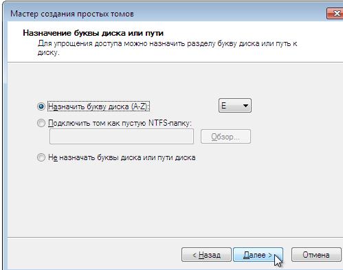 Выбираем букву для диска (обычно D: для второго, Е: для третьего и т.д). Поскольку символ D может быть занят оптическим приводом, необходимо заранее присвоить ему другую букву (впрочем, переименовать диски можно и позднее). Установив нужную букву, вновь жмём «Далее».