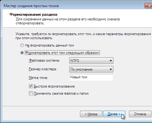 Теперь, осталось указать файловую систему (категорически рекомендую NTFS), и задать метку тома. Например: Data - для диска с данными, Store - для диска с архивами, Video – для диска, предназначенного под фильмотеку и т.п.. Далее, как обычно - «Далее».